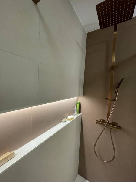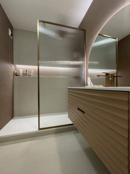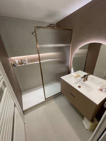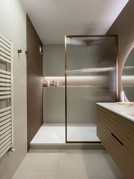 La pièce se distingue par un receveur de douche extra plate spacieuse style italienne, dotée d’une paroi en verre strié entourée d’un cadre métallisé aux finitions raffinées. L’éclairage intégré dans la niche murale souligne subtilement les textures et met en valeur les produits de soin, créant une ambiance chaleureuse et sophistiquée.