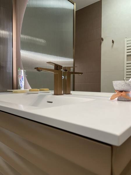 Le meuble vasque, au design sculpté et ondulé, apporte une touche de modernité tout en offrant de généreux espaces de rangement. Sa finition mate et son robinetterie assortie confèrent une signature visuelle unique, caractéristique du soin du détail apporté par Pertosa Design, spécialiste de la salle de bains à Lyon. Chaque élément du revêtement mural aux tons naturels jusqu’à l’optimisation de la lumière, a été sélectionné pour créer un environnement à la fois esthétique et durable.