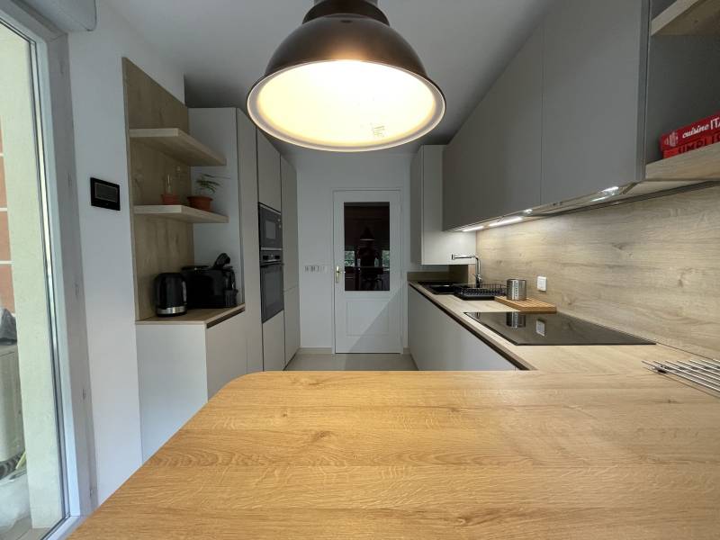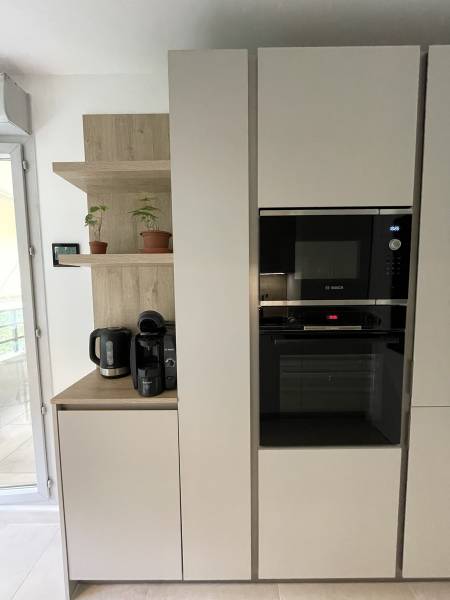 Dernière cuisine livrée alliant un parfait mélange de bois et une finition xmat beige. Retour table snack présent pour un confort d'utilisation.