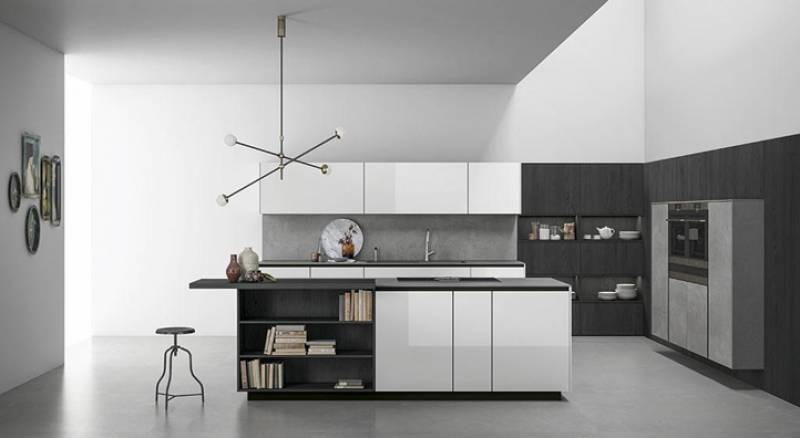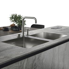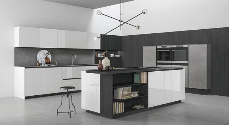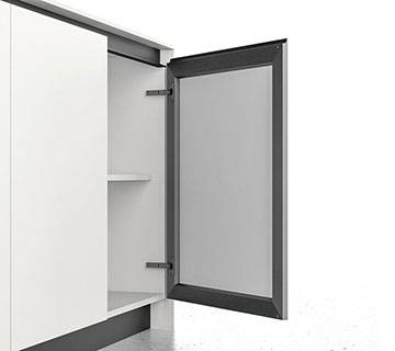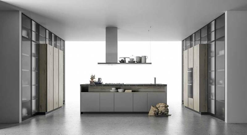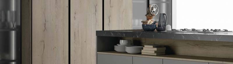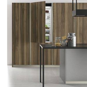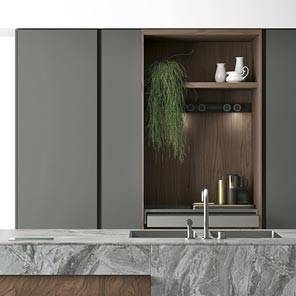 La conception polyvalente d'Aspen est due aux cadres en aluminium à revêtir à volonté et à la modularité. Il est ainsi possible de créer du mouvement même dans une composition tout en ordre et en symétrie, raffinée par la combinaison de Fenix NTM ® , de Bois naturel, de verre et de granit.