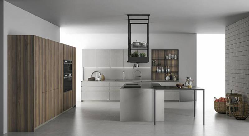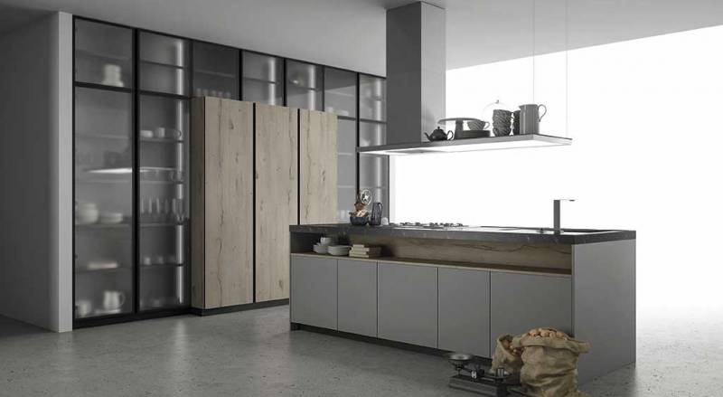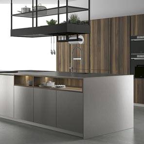 La gamme de cuisine Aspen est une collection à l'âme écologique. C'est une cuisine modulaire avec un cadre en aluminium, 100% recyclable, sur laquelle sont montés les panneaux avec la finition choisie, par exemple Fenix NTM ® , hygiénique, anti-empreintes digitales et doux au toucher.