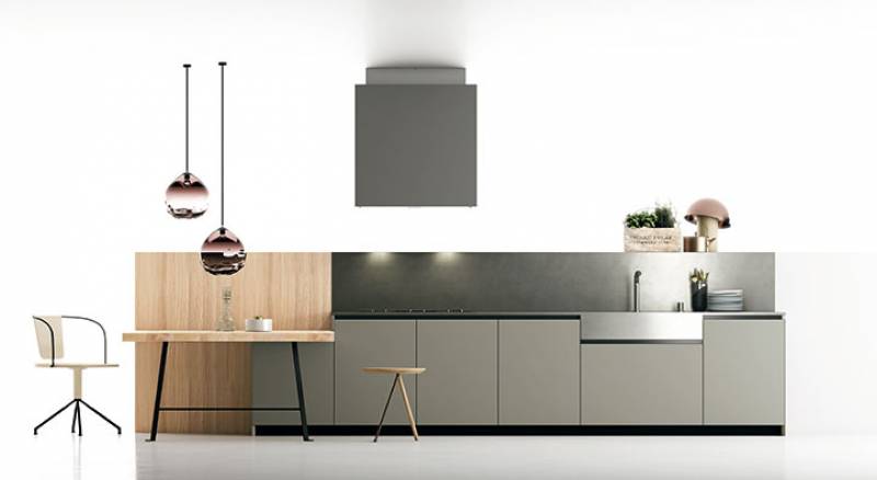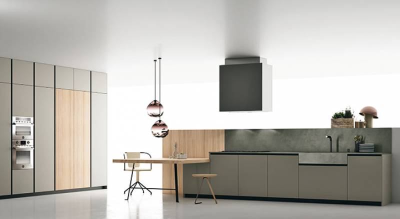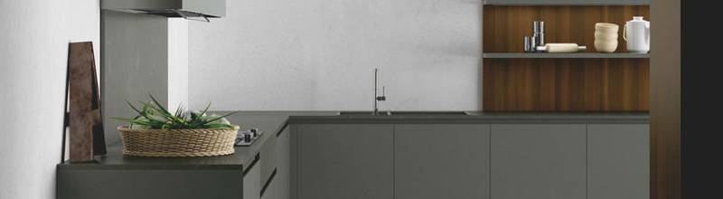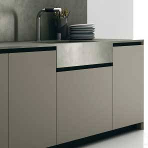 Le regard et le touché de la matière. Matéria est en fait une collection de cuisines avec des matériaux naturels, auxquels s'ajoutent des matériaux techniques et innovants. Les sensations au toucher sont soyeuses, à partir des bases laquées mates, de bois, de plan de travail en imitation marbre...