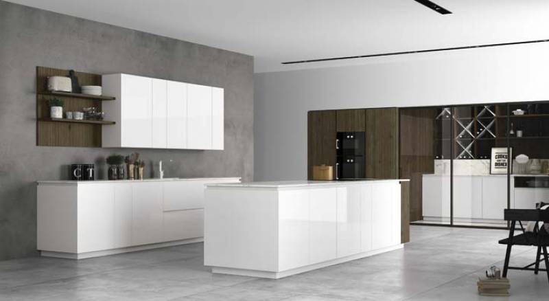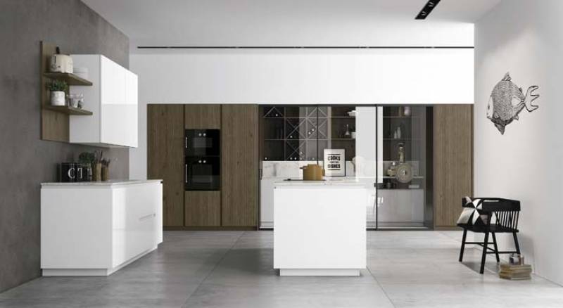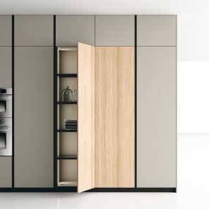 L'ambiance est réchauffée par les panneaux en bois naturel, traité thermiquement, ou bien les mélaminés bois de grande qualité. Egalement utilisés pour les colonnes avec une hauteur accrue du sol au plafond avec des fours intégrés. Les bases ont des portes avec ouverture de gorge, coupées à 30°. Les côtés, en revanche, coupés sur le côté à 45 ° et reliés aux bases, donnent l’effet d’une surface continue, d’un élégant monobloc.