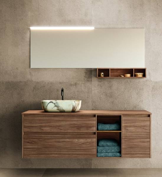 Le meuble vasque en bois strié peut être réalisé de façon standard ou sur mesure. Vous pouvez choisir la longueur de votre meuble et vous pouvez opter pour des tiroirs et/ou des portes voir même une niche si vous le souhaitez. Le plan vasque est également personnalisable ; il est possible de réaliser une simple vasque ou une double vasque dans le matériau de votre choix : résine, Solid Surface, céramique, Pierre Naturelle, etc... Libre à vous de choisir aussi la version vasque intégrée ou vasque à poser ; chaque meuble est unique !