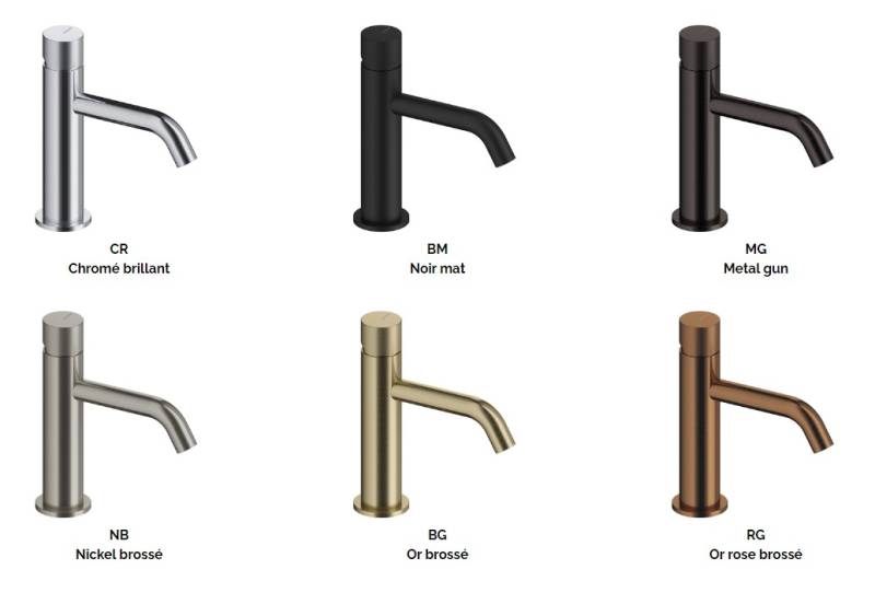 plusieurs finitions disponibles : mitigeur lavabo cuivre, or mat, nickel brossé, chromé, noir mat, gun