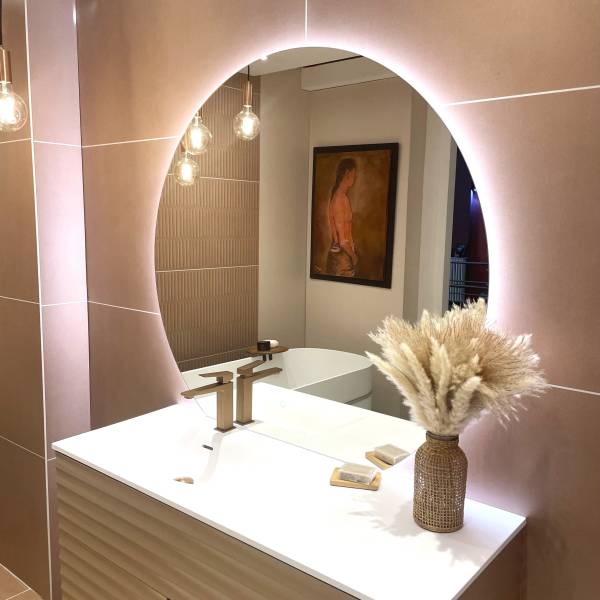 Et, pour parfaire cette présentation, nous avons également travaillé l'éclairage avec un grand miroir arrondi et rétro-éclairé modèle HORIZON et la pose de suspension au plafond en finition cuivre.