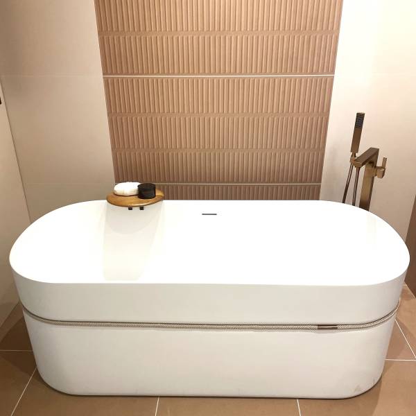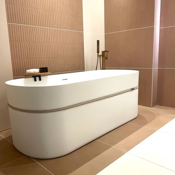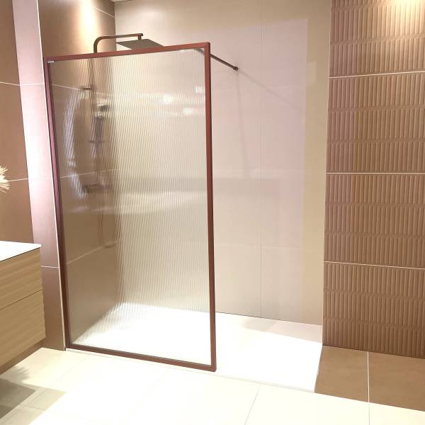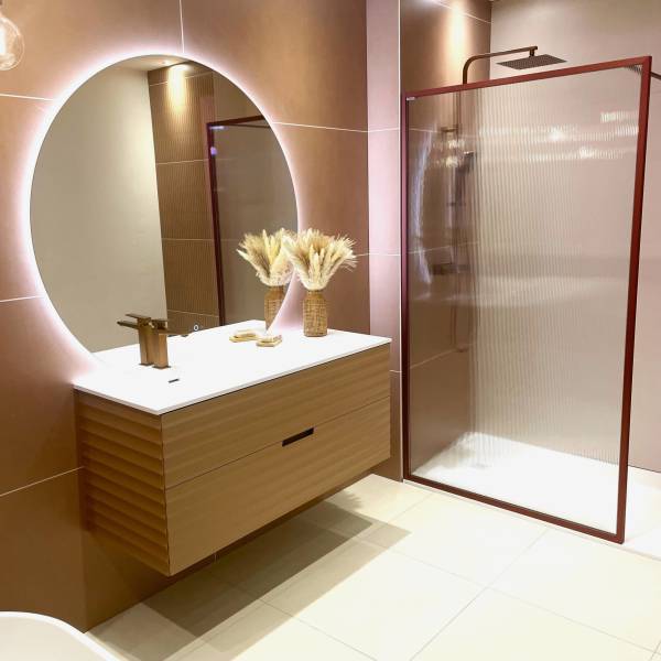 Nous vous proposons en exclusivité notre nouvelle ambiance " Terre de Sienne" alliant modernité et douceur. Cette salle de bains présentée dans notre salle d'exposition comprend une baignoire ilot à l'allure épurée et mate modèle TEMP , une spacieuse douche ouverte avec un receveur de douche extra plat et antidérapant modèle ONE et une paroi de douche en verre cannelé modèle NORDIC.