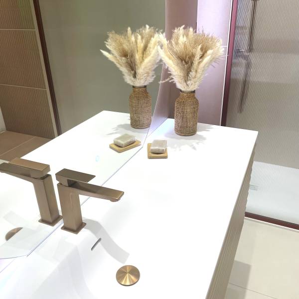 Le meuble vasque situé au centre de la pièce comprend une belle vasque intégrée en résine minérale mate et 2 tiroirs aux façades ondulées et laquées mates modèle HORN. La robinetterie aux lignes droites et design est proposée en finition PVD CUIVRE BROSSE modèle GRAFIK.