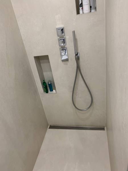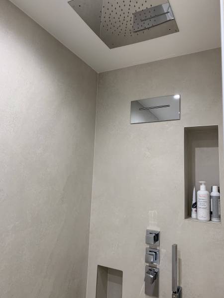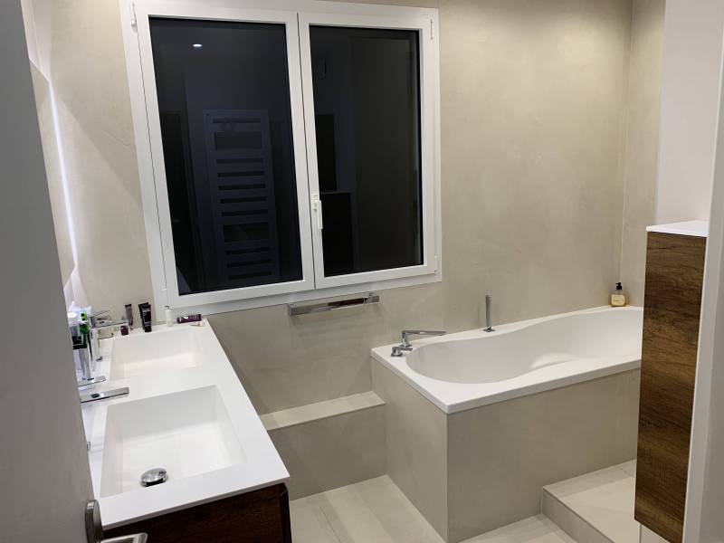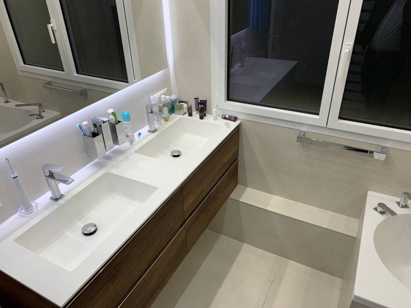 Belle réalisation pour cette grande salle de bains avec la création d'une douche italienne avec bonde type caniveau. La mise en place de robinetterie encastrée avec des niches dans le fond de douche apporte un coté design et pratique.