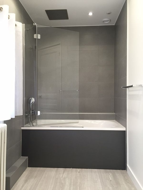 Baignoire Acrylique blanche avec robinetterie encastrée et pomme pluie dans le faux plafond