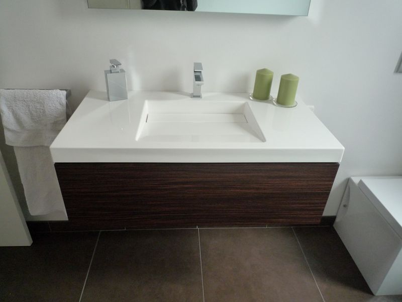 Rénovation d'une salle de bain clé en main comprenant : un meuble de salle de bain en finition bois sombre, un plan de toilette en résine minérale, une baignoire en résine avec habillage assorti au meuble.