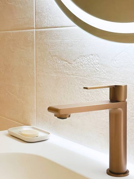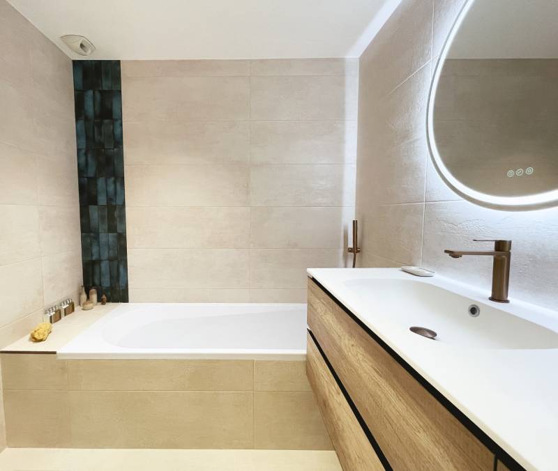 Ici nous avons traité des mélanges de matières qui s'harmonisent les unes avec les autres : Carrelage 30 x 90 cm ton Pierre beige, Meuble de salle de bains avec finition Bois, robinetterie Cuivre sur l'ensemble des éléments baignoire, douche, lavabo ainsi qu'une touche de carrelage petit format au ton nuancé bleu vert.