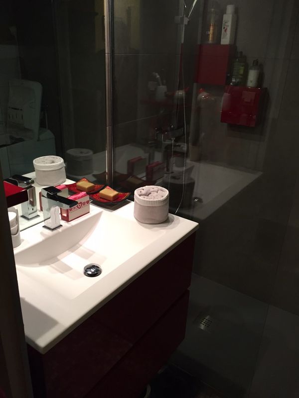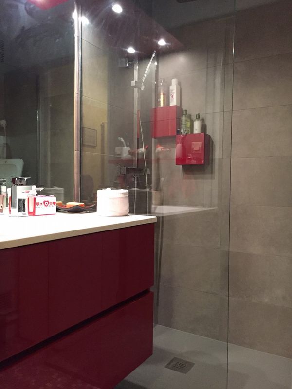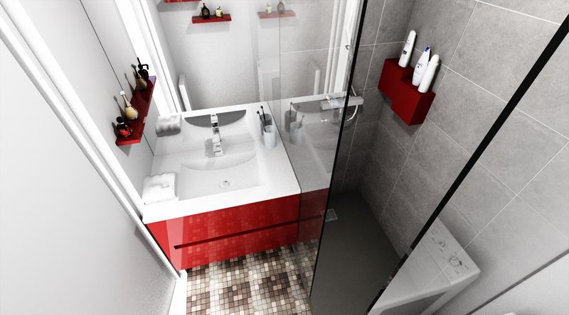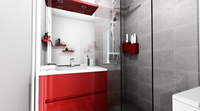 Cette petite salle de bain a été transformé afin de la moderniser ainsi que d'agrandir l'espace douche pour plus de confort. Le meuble en laqué rouge brillant amène une touche de caractère dans cet espace aux nuances de gris...